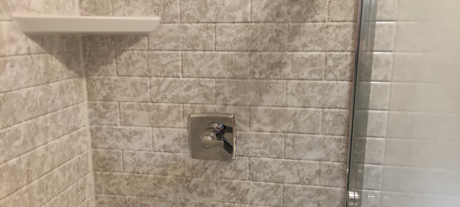 We began by removing Mrs. Pack’s existing walk-in shower and cleaning up any debris left over from the previous homeowner. Then, our team of experienced installers fitted the new shower with Silver Stone Subway tile walls and a 36 x 60 right hand shower pan. We also added a corner shelf for additional storage and a Delta shower trim head and faucet with a chrome finish.